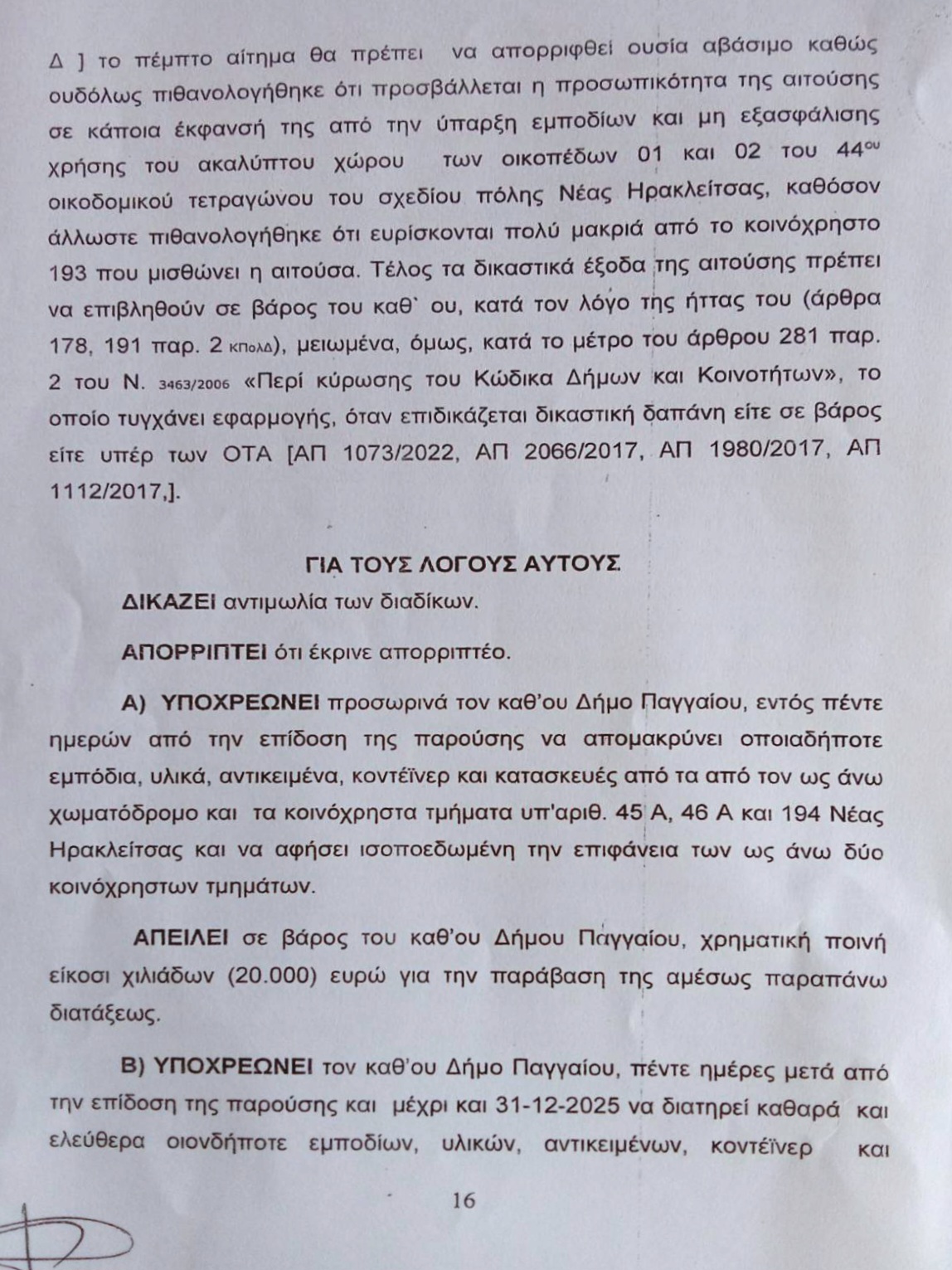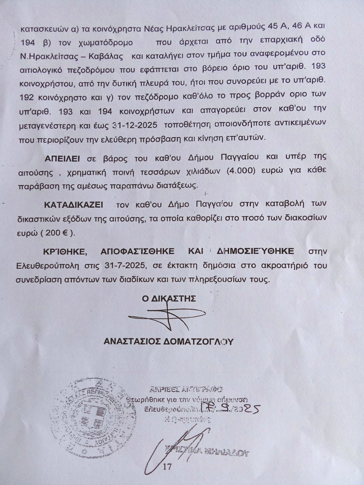 Σας αποστέλλω συνημμένα την πρόσφατη Δικαστική Απόφαση που καταδικάζει τον Δήμο Παγγαίου για την ανοχή και συνενοχή του στην αυθαίρετη κατάληψη του αιγιαλού στην περιοχή της αλάνας της Νέας Ηρακλείτσας από ιδιώτες επενδυτές.